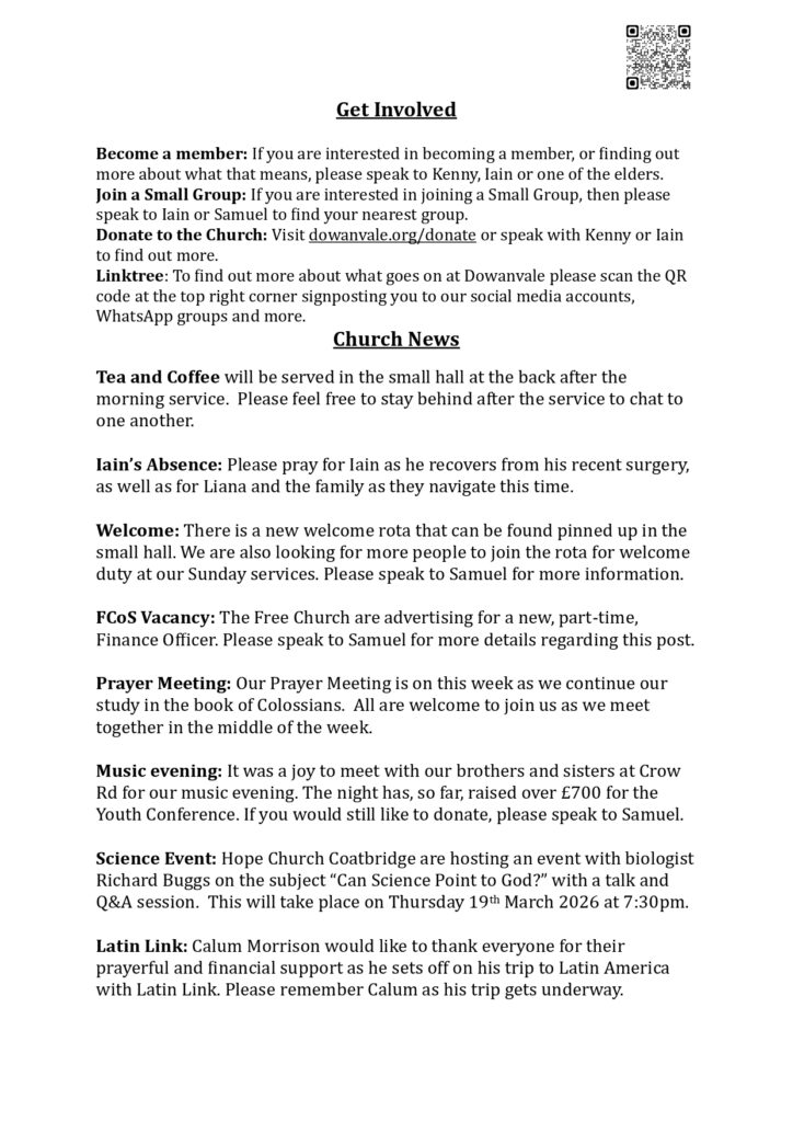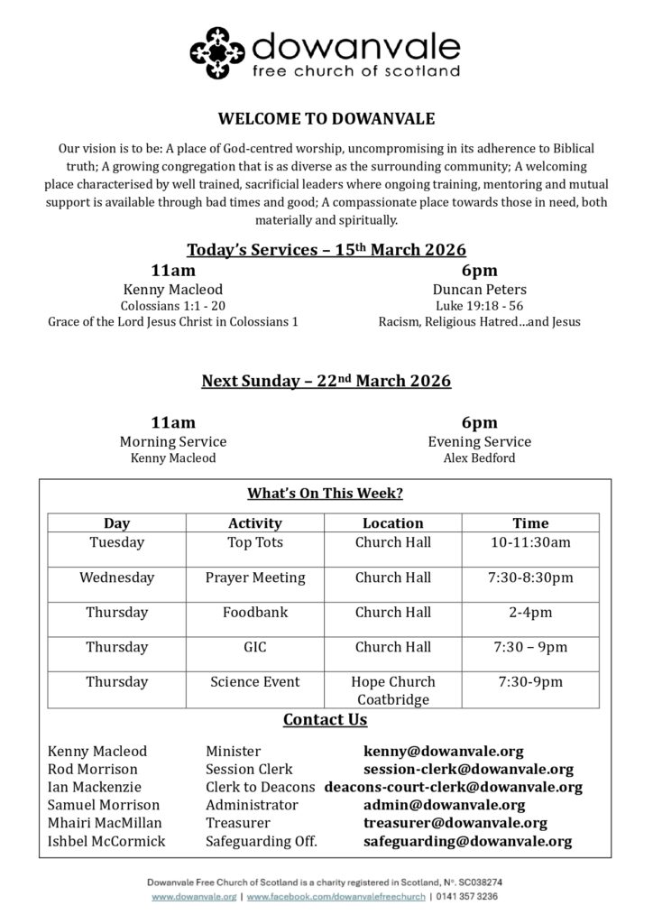 Dowanvale Free Church of Scotland is a charity registered in Scotland, No. SC038274.